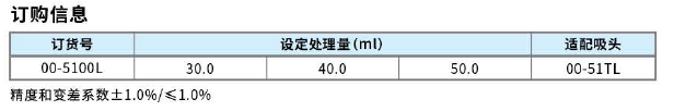 日本立洋MODEL5100可调超大量移液器,其具有可供两种型号移液器,每种有三种可调设定处理量。处理量的设定可通过更换处理量调节管完成。其他设定处理量可定制购买,其处理量应在15至25ml或30至50ml之间 。
